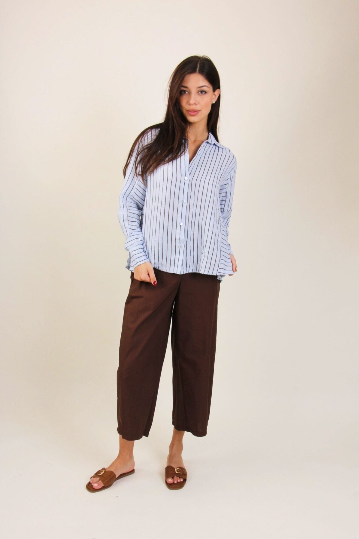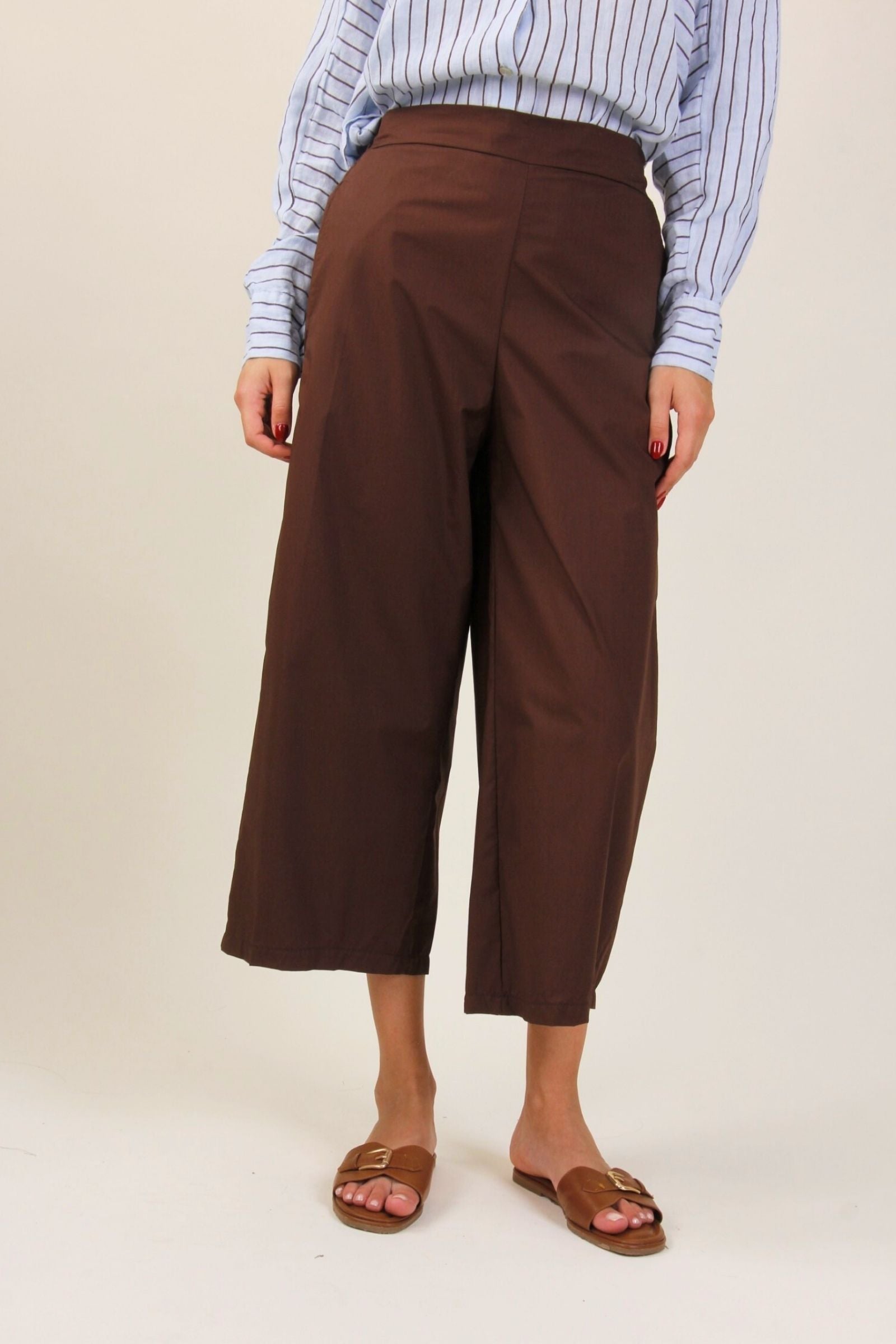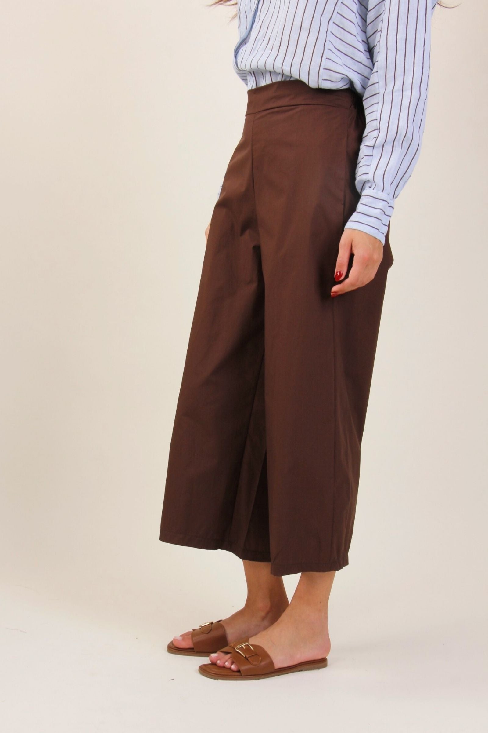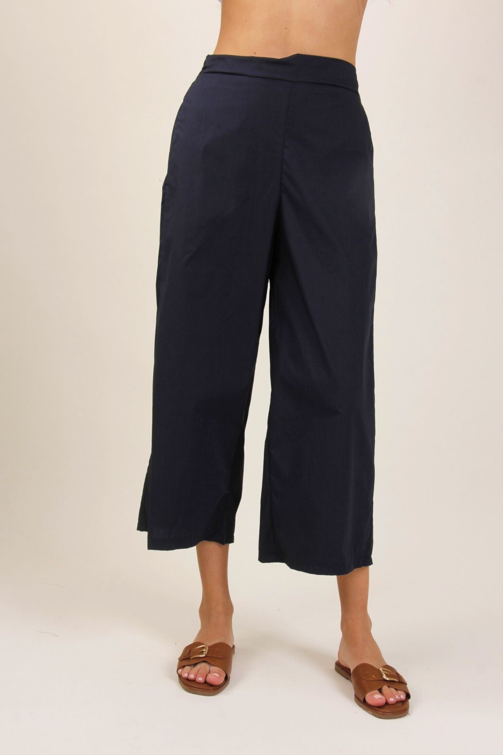 Pantaloni donna in fresco popeline di cotone, caratterizzati da un taglio culotte alla caviglia e linea ampia. Il design pulito con vita liscia davanti e dettaglio elasticizzato dietro garantisce una vestibilità comoda e moderna. Versatili e leggeri, sono perfetti per creare look casual chic durante la stagione estiva. Ideali da abbinare a top leggeri, camicie o bluse per un outfit essenziale ma sofisticato.