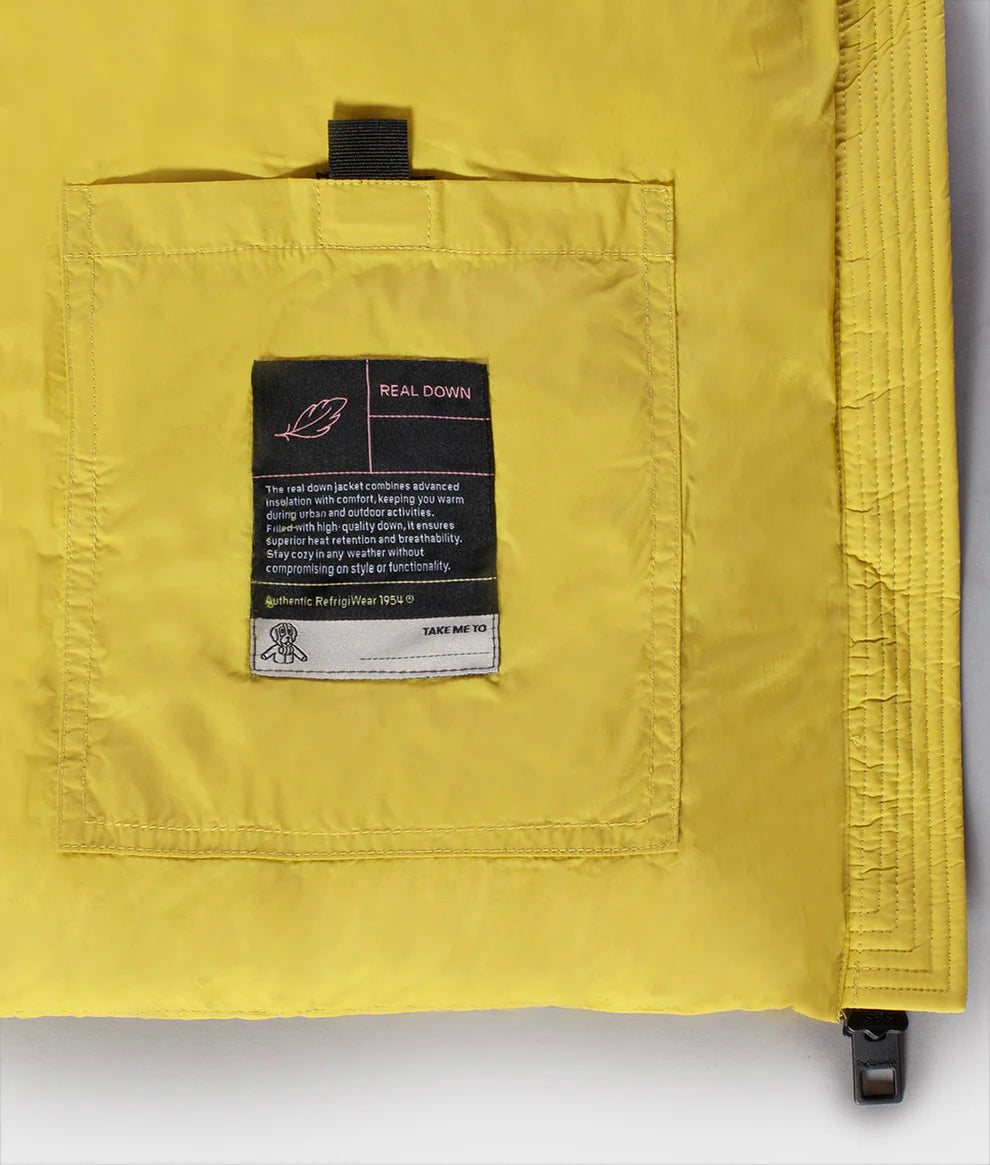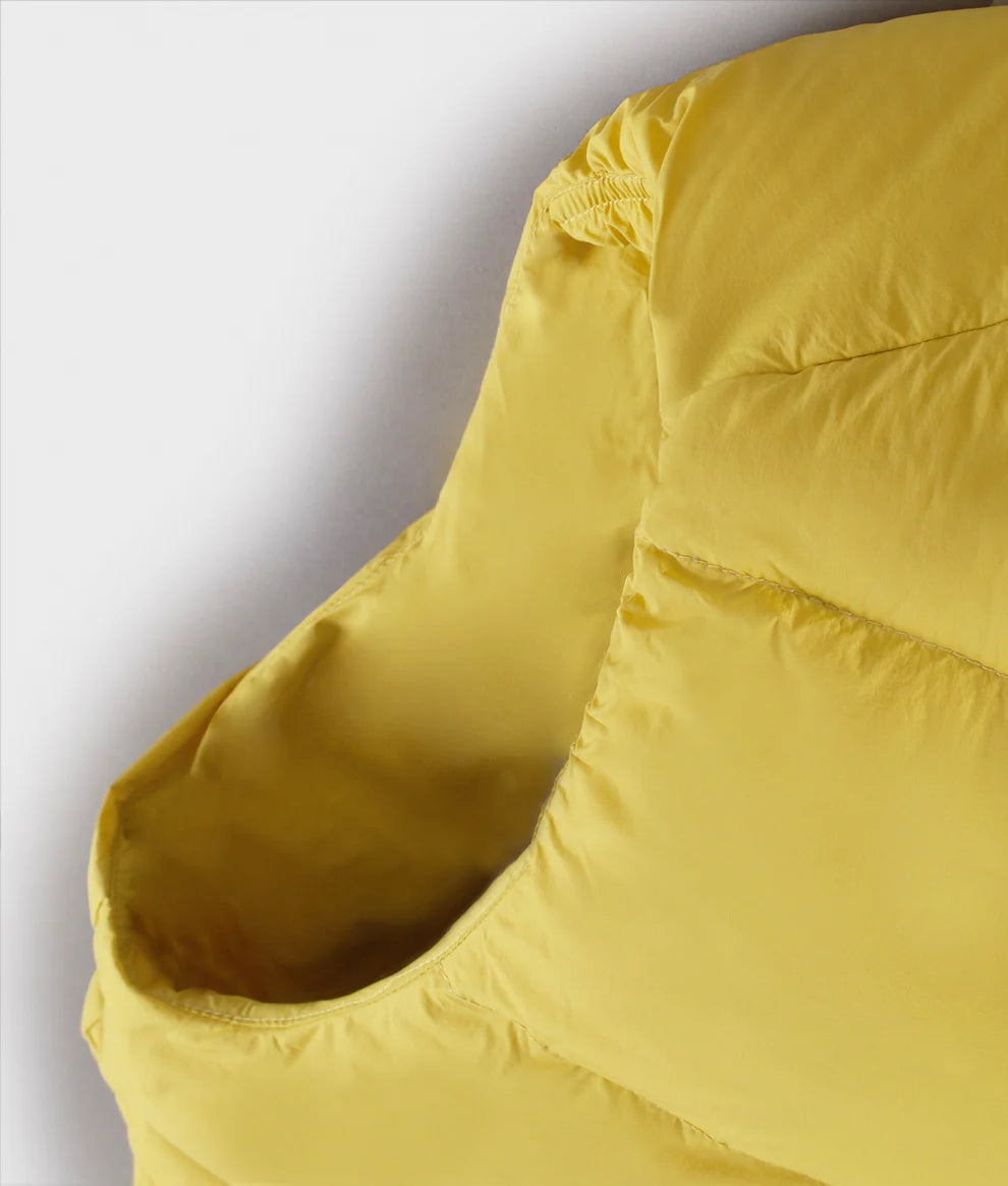 Piumino smanicato da donna dal taglio crop e contemporano, con trapunta orizzontale ampia e un fit leggermente oversize. Il collo in piedi e lo stile essenziale lo rendono un capo incredibilmente trasversale. Realizzato in nylon ultra-light dall’aspetto opaco e soft touch, protegge da vento e agenti atmosferici. L’imbottitura è in 100% piuma 90-10 certificata RDS, che garantisce calore e protezione senza rinunciare alla leggerezza e praticità.
