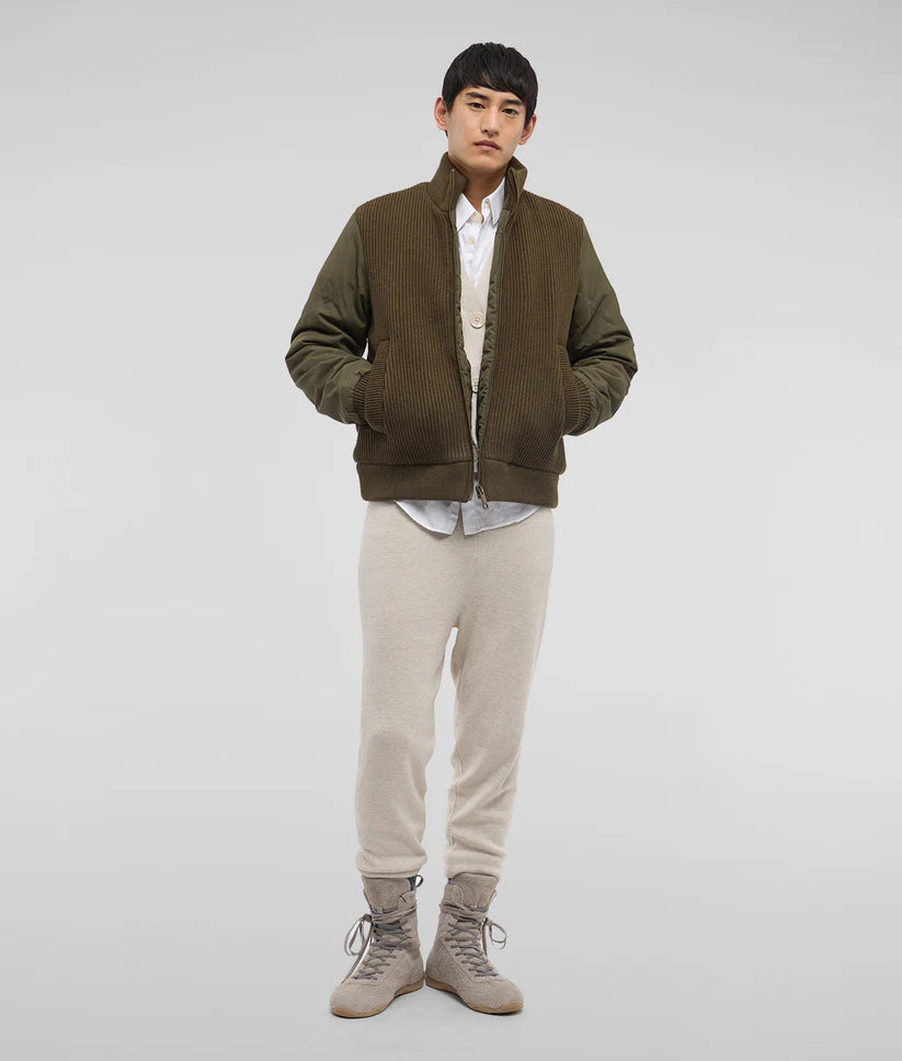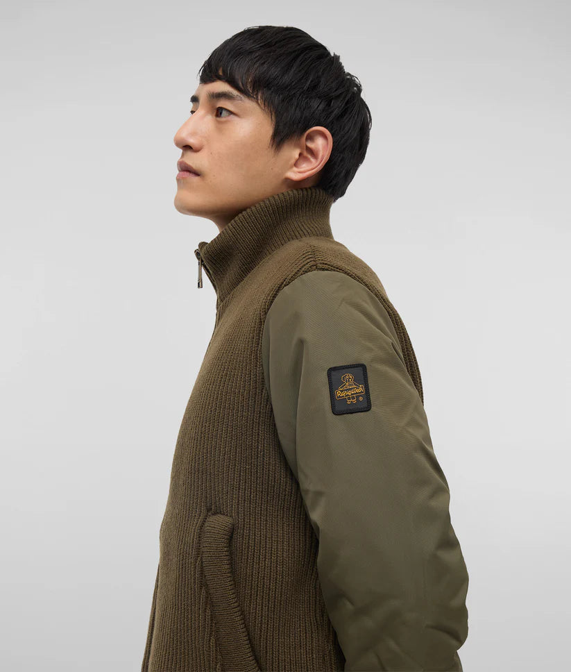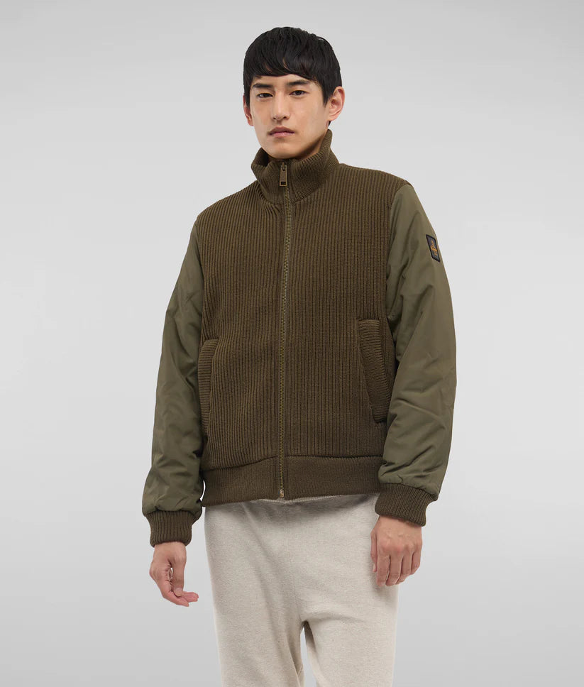 Questo bomber invernale ibrido è un capo distintivo, caratterizzato da tessuti a contrasto che combinano un corpo in maglia elasticizzata a costine con maniche in resistente nylon oxford. L'imbottitura termica RefrigiWear® offre protezione e comfort in ogni condizione climatica, rendendolo ideale per affrontare l'inverno con stile. Dotato di una pratica chiusura con zip, collo in piedi e tasche a filetto sul fronte, questo capo versatile può essere utilizzato sia come giacca che come cardigan pesante. Perfetto per chi cerca un look funzionale e moderno.